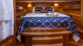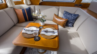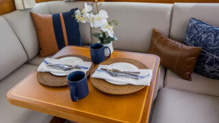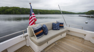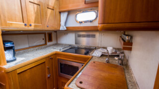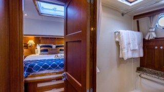 DEFIANCE features two sumptuous Staterooms, two luxury Heads, Gourmet Galley down, Custom Granite CounterTops throughout, full Utility room, a spacious Salon with natural leather settees, Teak Dining Table, Power Sunroof, anda large Cockpit with Wet Bar, integral seating and overhead Awning.