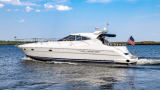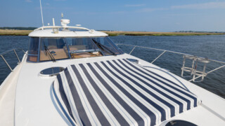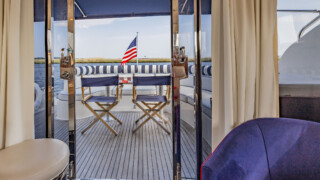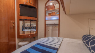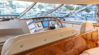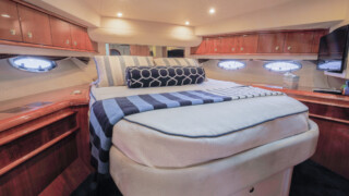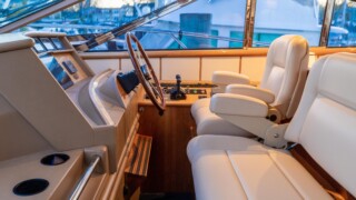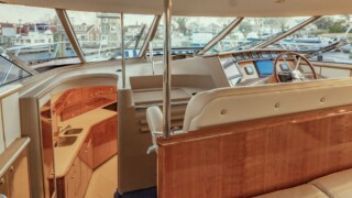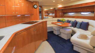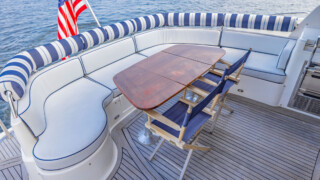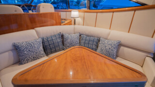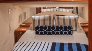 Comfort abounds for owners and guests as they relax in the three entertainment spaces: the large open cockpit with a huge curved settee, high-gloss table, grill, icemaker, wet bar and awning; the helm deck with 360 degree visibility, power windows, power sunroof, extensive seating and extending table; or the warm sumptuous lower salon with wraparound U- shaped settee, an electric hi-lo table, and a gourmet galley for preparing lavish feasts or the simplest fare. All three seating areas were reupholstered in 2022.